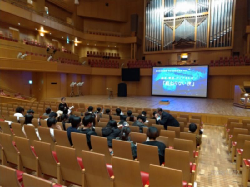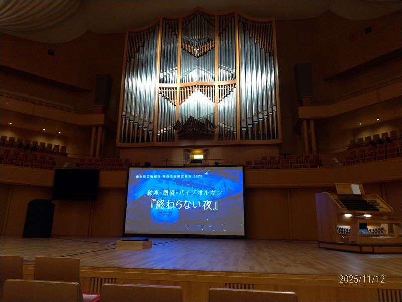 学校生活 芸術鑑賞会を実施しました 2025年11月13日 毎年恒例の芸術鑑賞会として、令和7年 11月12日(水)に愛知県芸術文化センター内の愛知県芸術劇場で、パイプオルガン×朗読×絵「終わらない夜」を鑑賞しました。美しい絵と音楽と朗読に包まれた素敵な時間を、仲間とともに過ごすことができました。